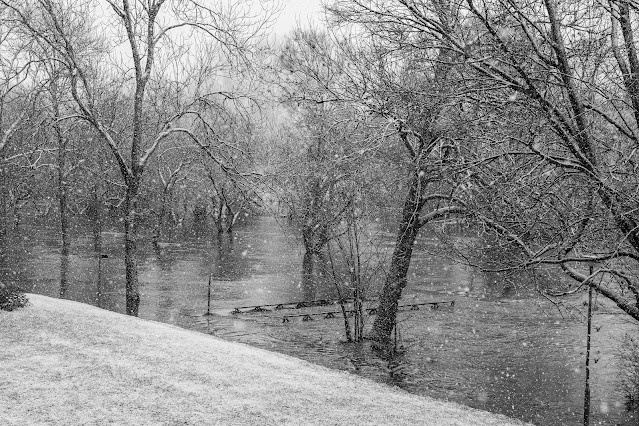 Solen skiner inte. Det snöar. Men det är vatten av en annan karaktär än föregående bild. |